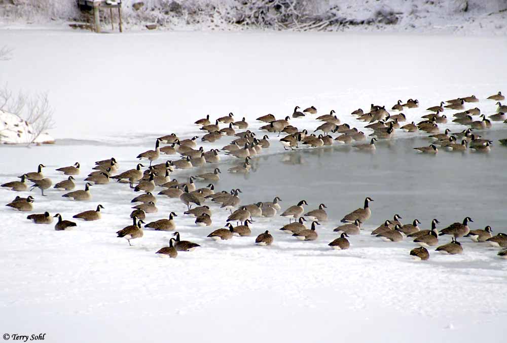 - Resident Geese: They continue pond-hopping and foraging for food on grassy areas and agricultural fields. If lakes freeze over, geese will fly to lakes with working fountains to find open water.