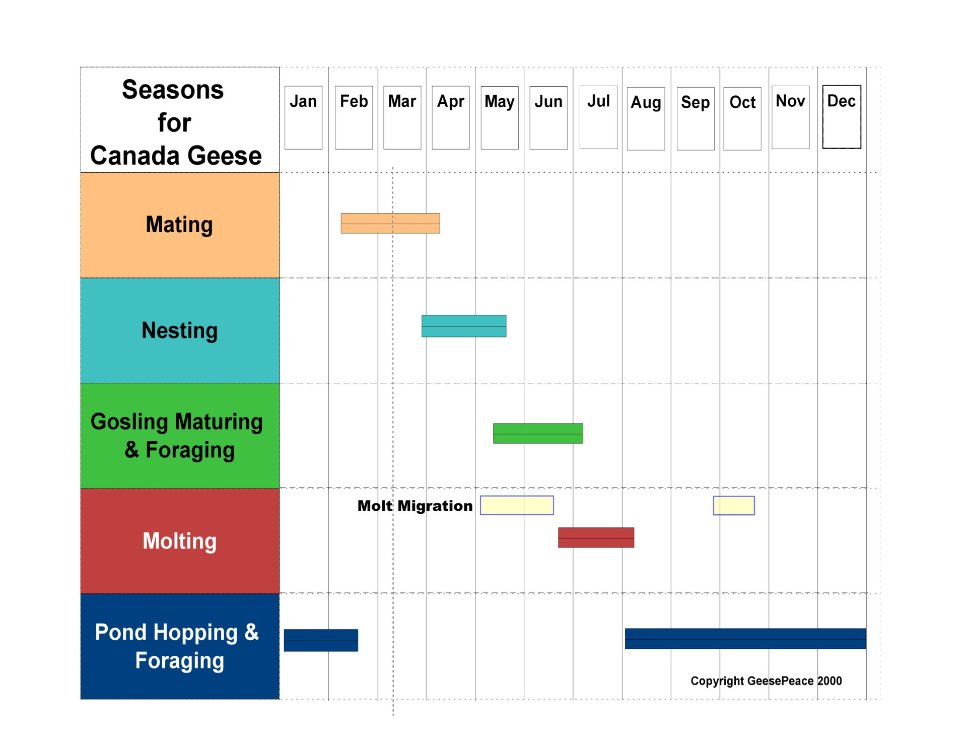 January – What's happening? All geese can fly. They are pond-hopping and foraging.